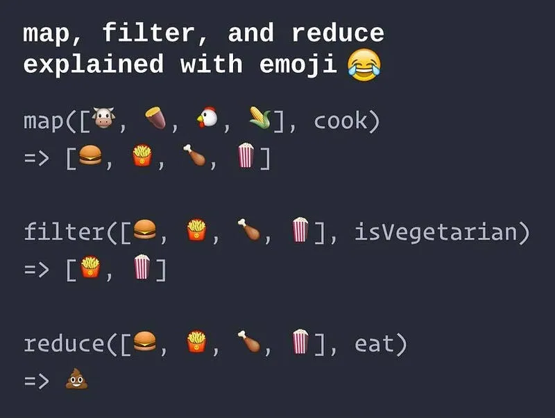 Javascript mette a disposizioni le funzioni map, reduce e filter per effettuare operazioni sui dati di un array. Per spiegare il funzionamento di questi tre metodi basta guardare la seguente immagine.