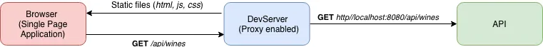 Angular utilizza Webpack come tool di sviluppo. Webpack adotta un server di sviluppo, DevServer, che può essere configurato per agire da proxy tra la SPA e il server delle API. Questa configurazione è utile quando il server è su un altro dominio. Quando DevServer è configurato come proxy, il client effettua richieste HTTP sullo stesso dominio della applicazione front end. In pratica, DevServer si occupa di mediare la comunicazione tra Single Page Application e server backend.